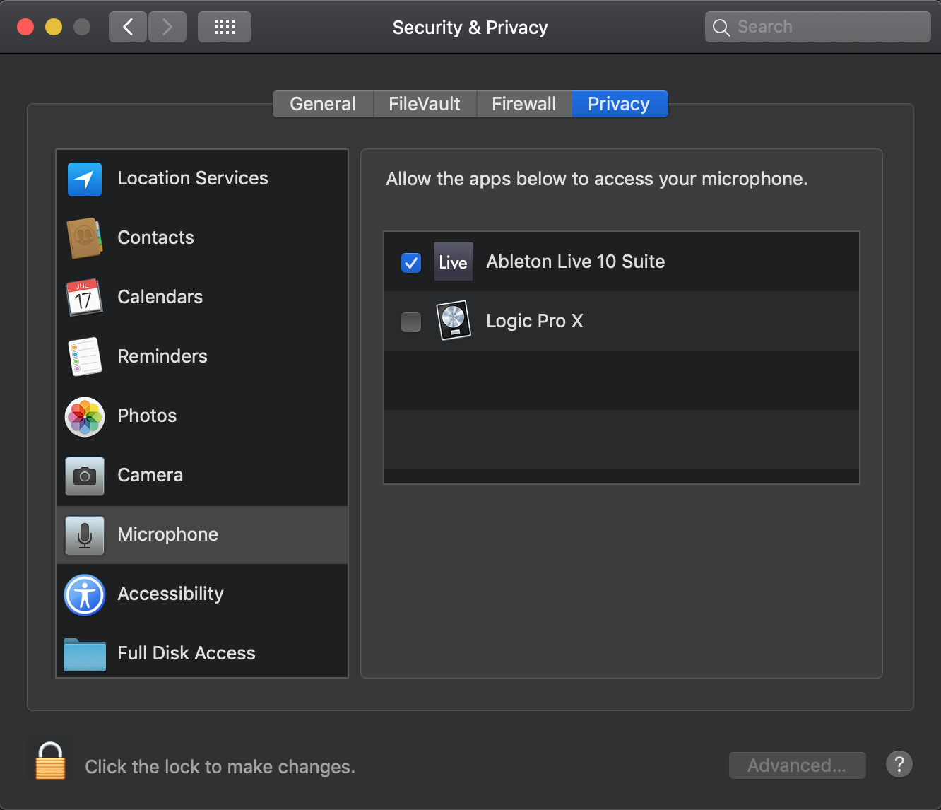 2. Select the Privacy tab and in the column on the left, select Microphone. If you did set this up correctly through the audio input device and the dialog box, you will have your DAW already ticked like in this example -