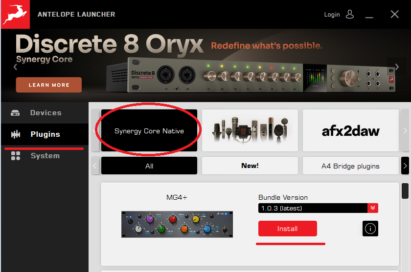 After installation, open the Launcher and navigate to the “Plugins” section. Select “Synergy Core Native” and install the latest bundle for MG4+