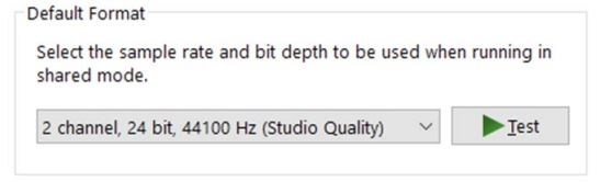 6. Enter the ‘Advanced’ tab and choose any of the available “2 channel, 24-bit” modes from the drop-down menu. Click ‘OK’ to close the window.