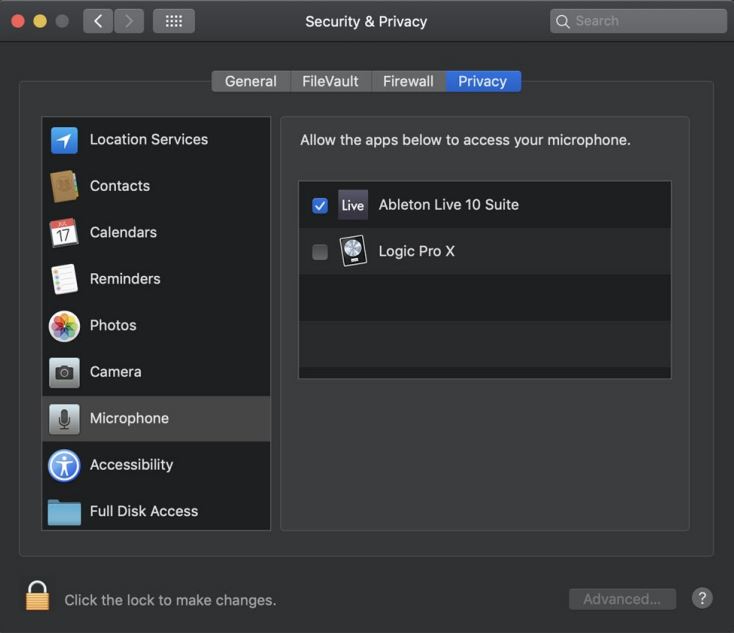 2. Click the 'Privacy' tab. In the column on the left, choose ‘Microphone’. Make sure there's a checkmark next to any DAW you want to use.