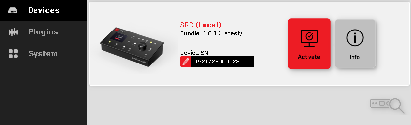 Antes de continuar, asegúrate de que la interfaz de Orion Studio Synergy Core esté completamente actualizada para poder usar el control remoto SRC. Ve al menú "Manage Device" de la interfaz e instala el Bundle Version más reciente disponible.
