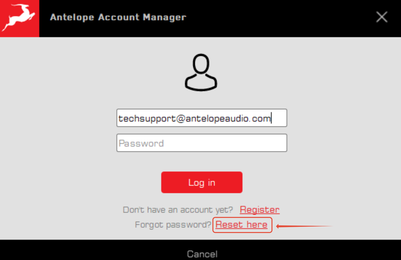 Antelope Account Manager の「Forgot Password. Reset here」から